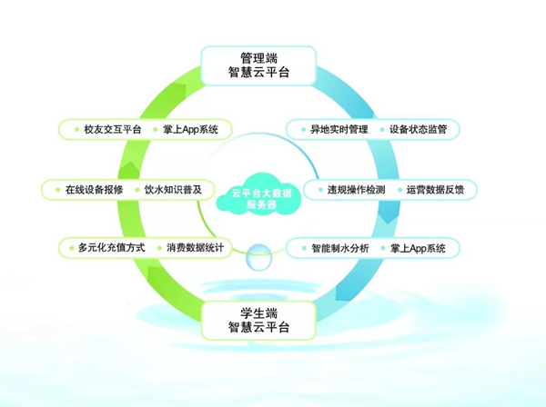 此外,榮事達(dá)著眼校園直飲水的互聯(lián)網(wǎng)化建設(shè),依托先進(jìn)的云端大數(shù)據(jù)平臺、無線網(wǎng)絡(luò)體系和智能一卡通技術(shù)等,創(chuàng)新打造ultraWiFi智慧管理系統(tǒng),系統(tǒng)直連ultraWiFi凈水主機(jī)、開水器、飲水機(jī)等終端定制設(shè)備,實現(xiàn)精細(xì)化管理。學(xué)生在使用中不僅能查詢飲水消費(fèi)記錄、在線報修設(shè)備、與校友交流等,還能擁有多元化充值方式選擇,充分享受快捷的智能化飲水體驗。 同時設(shè)備運(yùn)營商也可通過電腦或手機(jī)APP端口接入云數(shù)據(jù)平臺,異地監(jiān)測工程運(yùn)行狀況,實時掌握水電成本、消費(fèi)收益、設(shè)備狀態(tài)等數(shù)據(jù)信息,日常管理更簡單。