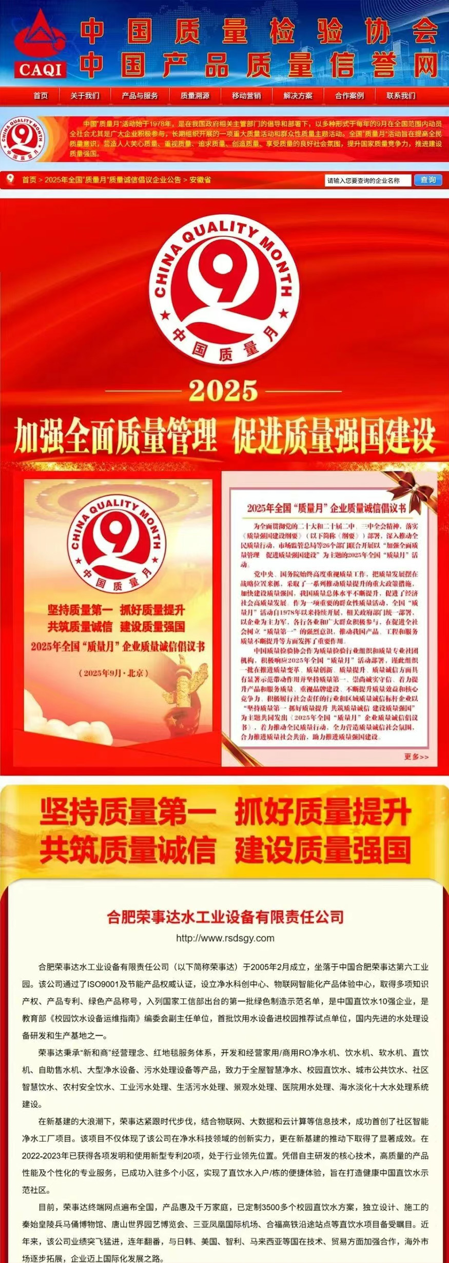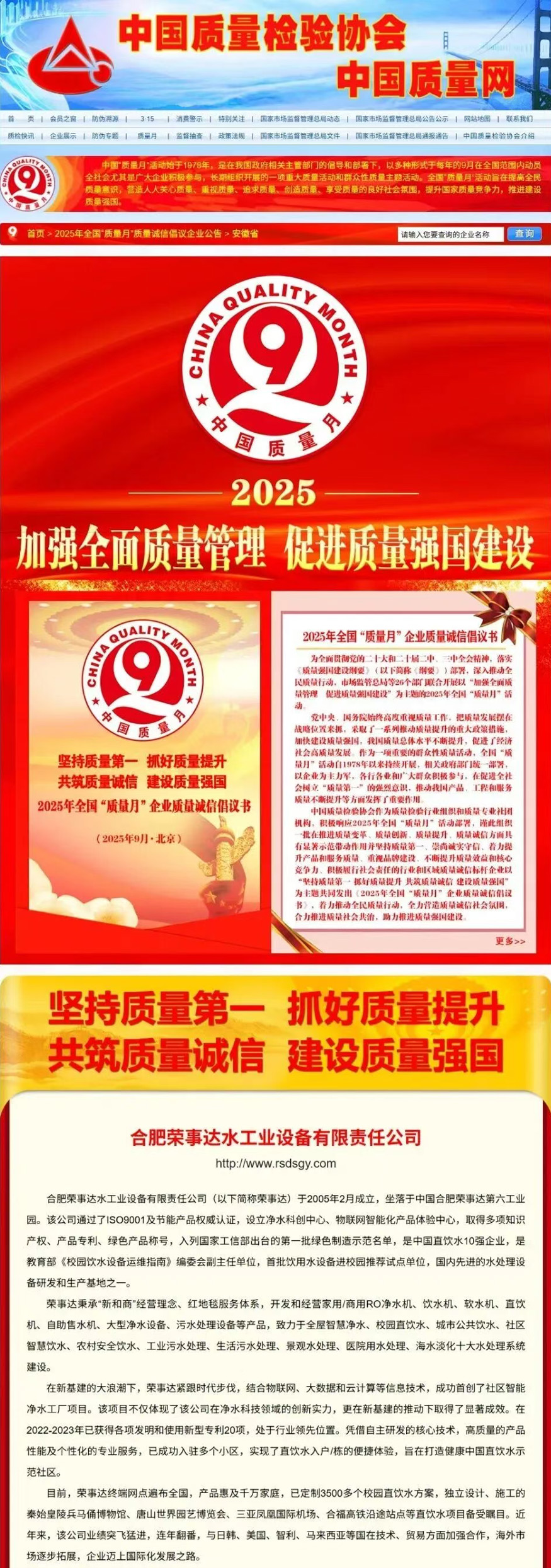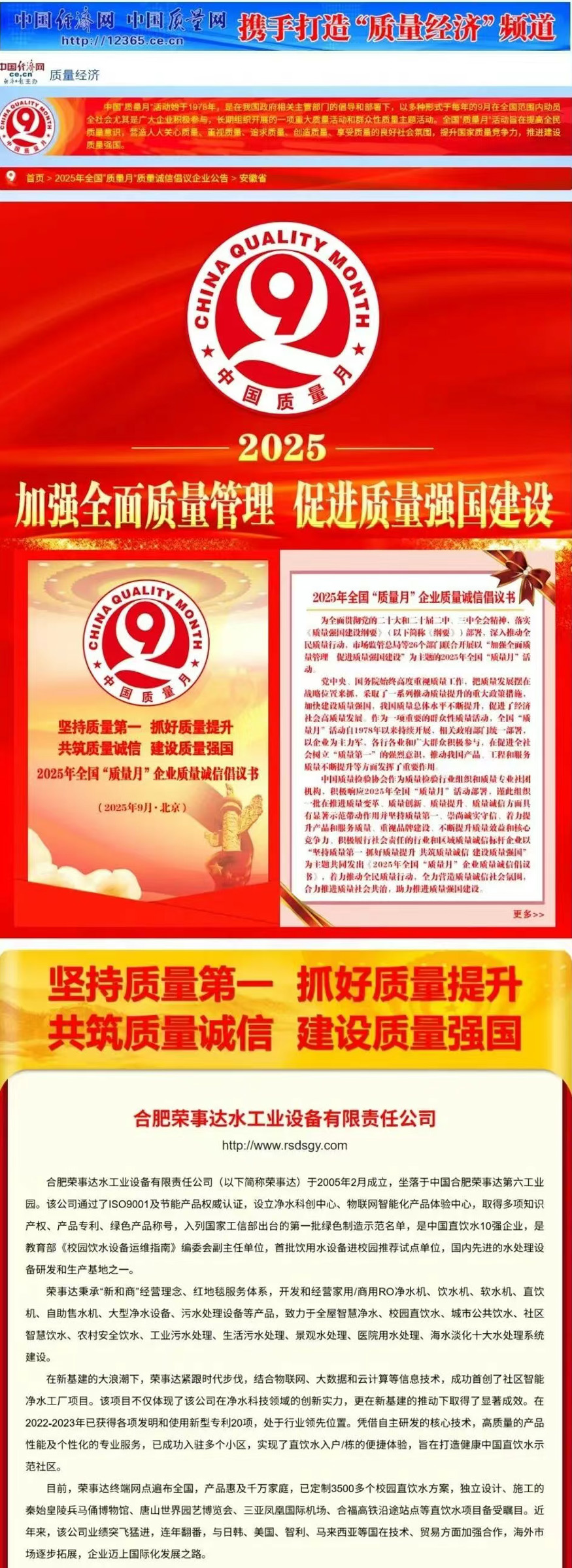 • 熱烈祝賀榮事達水工業在2025年全國“質量月”活動中斬獲“全國凈水行業質量領先品牌”“全國消費者質量信譽保障產品”等五項殊榮