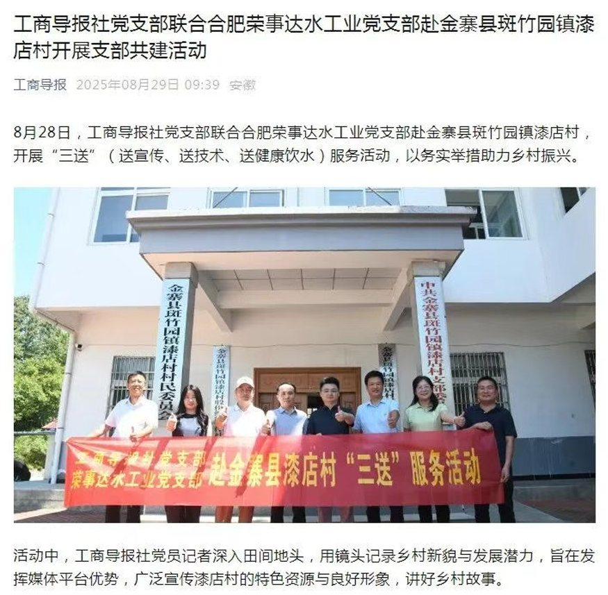 • 榮事達(dá)水工業(yè)公司黨支部攜手工商導(dǎo)報(bào)社黨支部:持續(xù)助力金寨縣漆店村,共筑鄉(xiāng)村振興夢